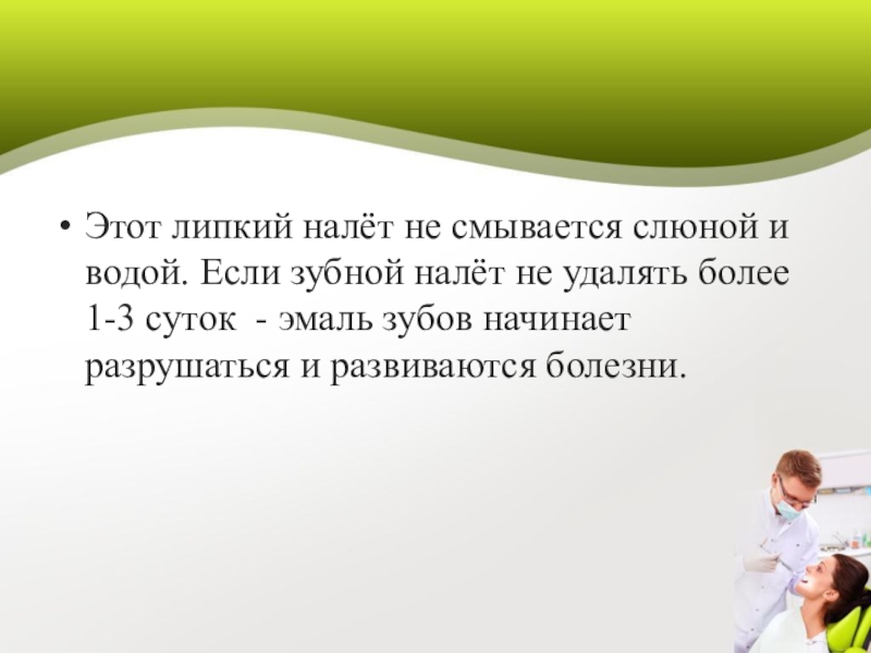Слайд 8Этот липкий налёт не смывается слюной и водой. Если зубной налёт