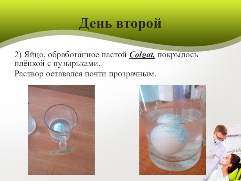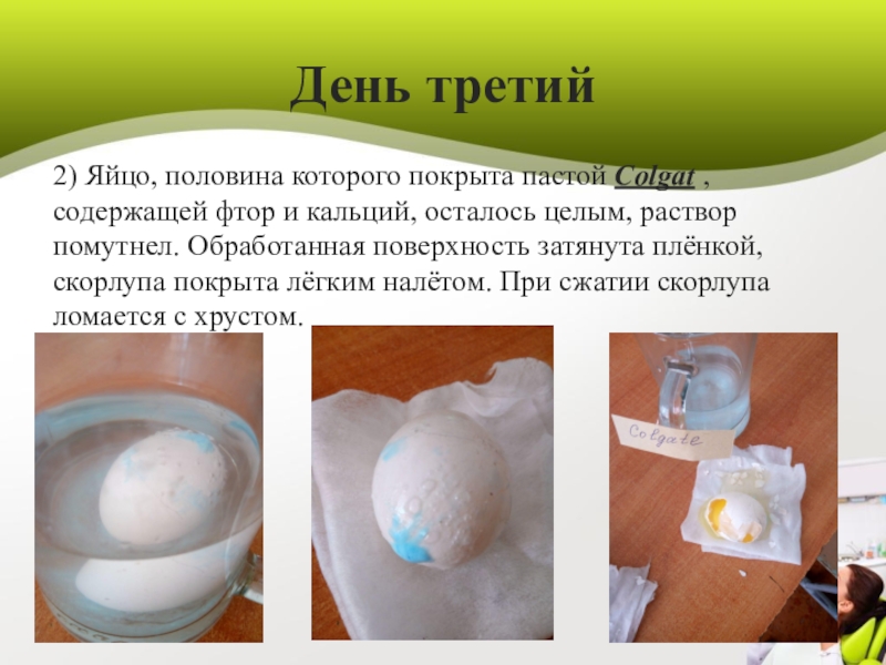 2) Яйцо, половина которого покрыта пастой Colgаt , содержащей фтор
