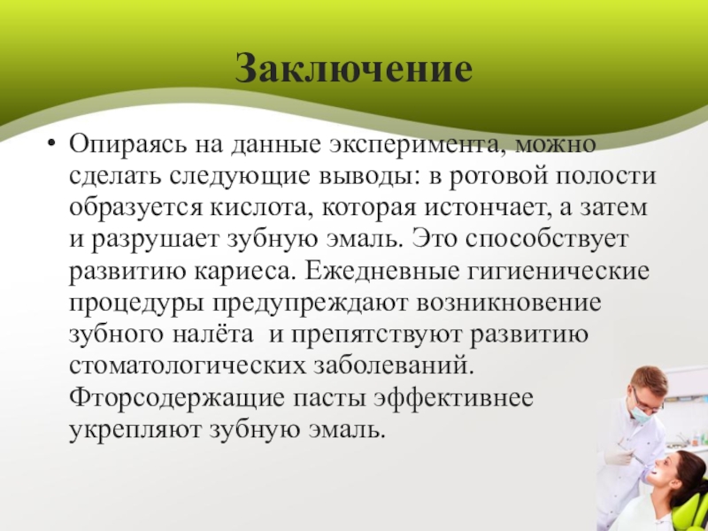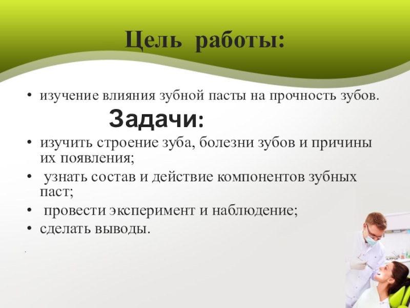 вызывающие. Познакомился с историей возникновения чистящих средств , видами зубной пасты. А так же узнал о том, что зубная паста может содержать вредные вещества. Изучил мнения учёных медиков , провёл опыты и сделал выводы: регулярная и тщательная гигиена зубов, а также своевременное посещение стоматолога поможет сохранить зубы здоровыми.