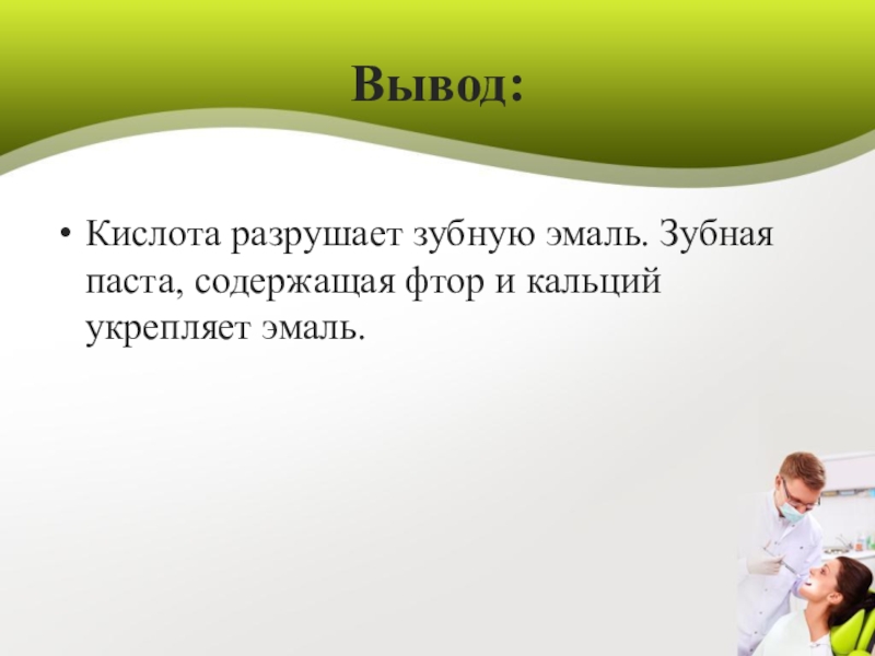 Кислота разрушает зубную эмаль. Зубная паста, содержащая фтор и кальций укрепляет