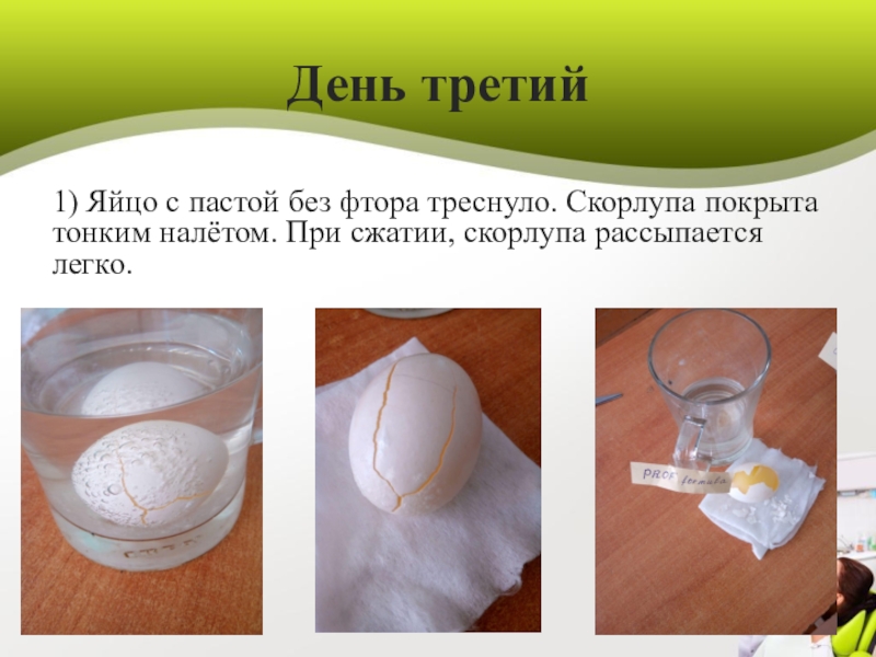 1) Яйцо с пастой без фтора треснуло. Скорлупа покрыта тонким