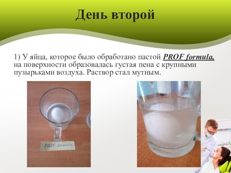 2)Половину одного яйца обработал зубной пастой PROF formula, а второе - пастой Colgаt.