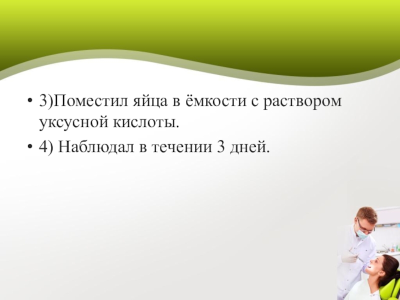 Слайд 233)Поместил яйца в ёмкости с раствором уксусной кислоты.
