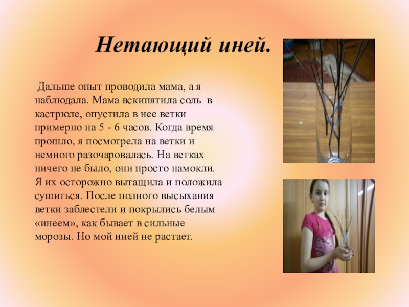 вскипятила соль в кастрюле, опустила в нее ветки примерно на 5 - 6 часов. Когда время прошло, я посмотрела на ветки и немного разочаровалась. На ветках ничего не было, они просто намокли. Я их осторожно вытащила и положила сушиться. После полного высыхания ветки заблестели и покрылись белым «инеем», как бывает в сильные морозы. Но мой иней не растает.