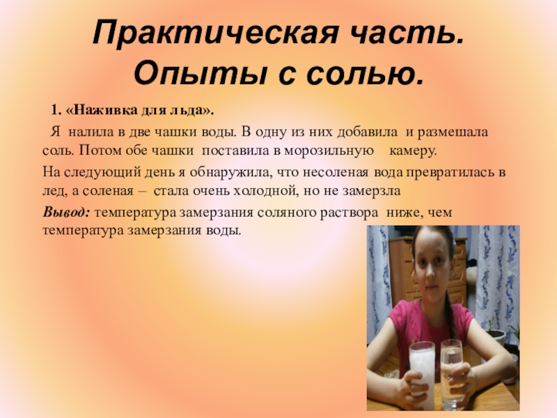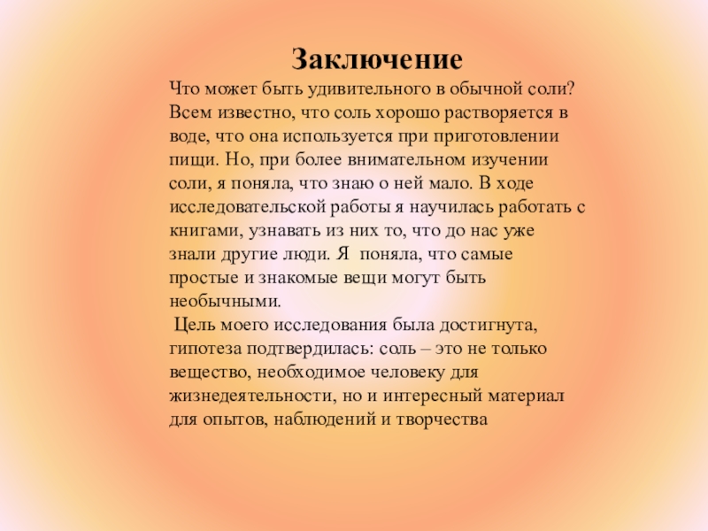 соль хорошо растворяется в воде, что она используется при приготовлении пищи. Но, при более внимательном изучении соли, я поняла, что знаю о ней мало. В ходе исследовательской работы я научилась работать с книгами, узнавать из них то, что до нас уже знали другие люди. Я поняла, что самые простые и знакомые вещи могут быть необычными.