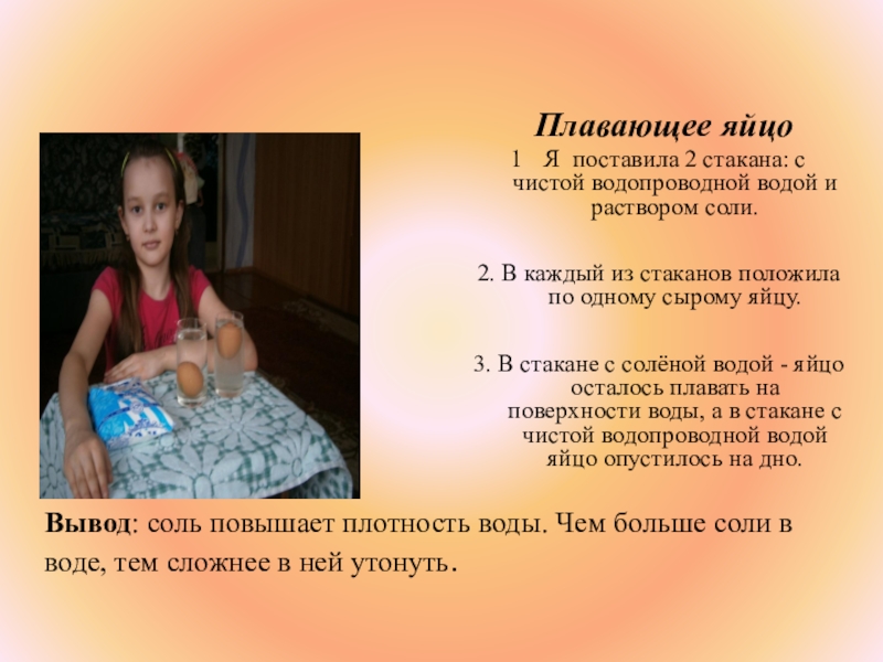 Вывод: соль повышает плотность воды. Чем больше соли в воде, тем сложнее в ней утонуть.