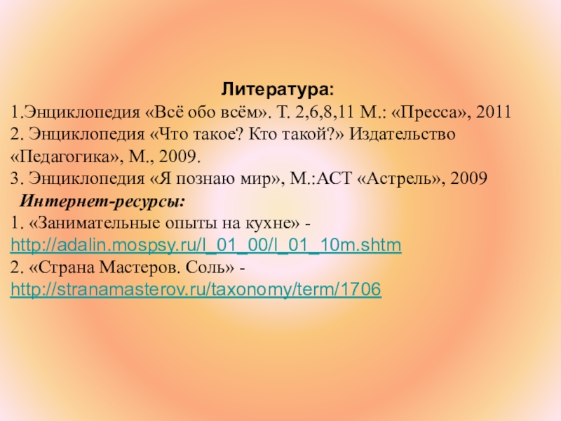 1.Энциклопедия «Всё обо всём». Т. 2,6,8,11 М.: «Пресса», 2011