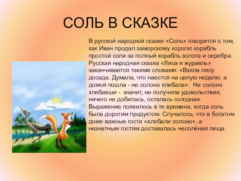 Русская народная сказка «Лиса и журавль» заканчивается такими словами: «Взяла лису досада. Думала, что наестся на целую неделю, а домой пошла - не солоно хлебала». Не солоно хлебавши - значит, не получила удовольствия, ничего не добилась, осталась голодная. Выражение появилось в те времена, когда соль была дорогим продуктом. Случалось, что в богатом доме важные гости «хлебали солоно», а незнатным гостям доставалась несолёная пища.
