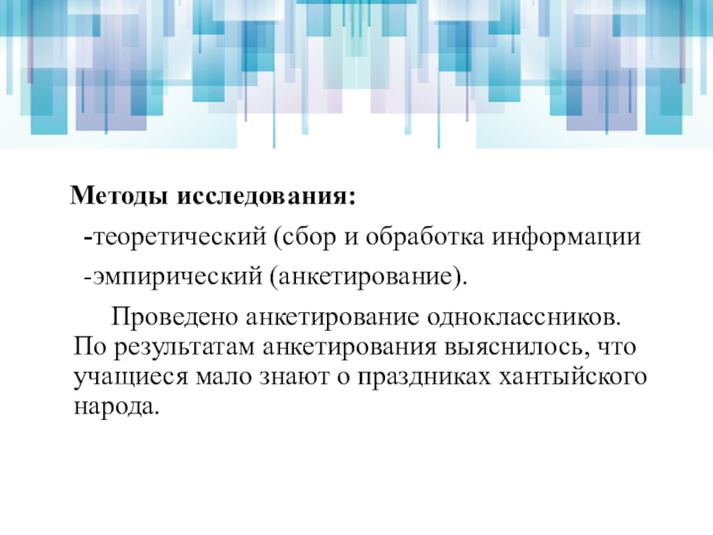 Методы исследования:  -теоретический (сбор и обработка информации  -эмпирический (анкетирование).