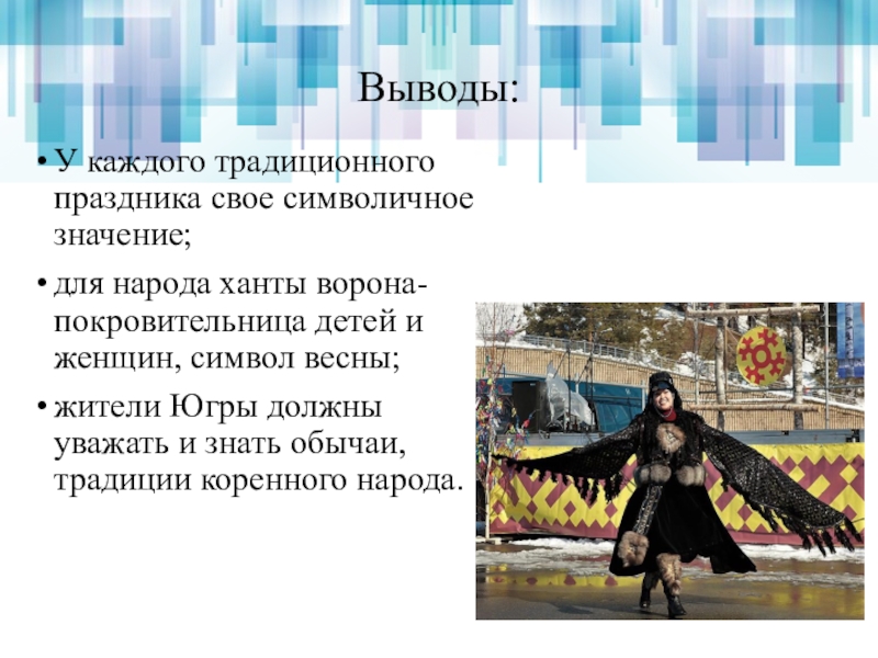 Выводы:У каждого традиционного праздника свое символичное значение;для народа ханты ворона-покровительница детей и женщин, символ весны;жители Югры должны