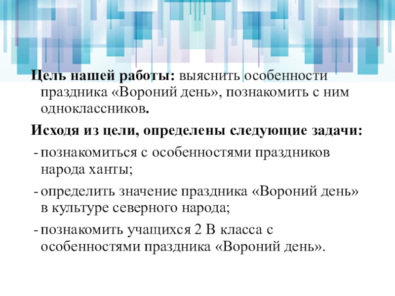 Цель нашей работы: выяснить особенности праздника «Вороний день», познакомить с ним одноклассников.Исходя из цели, определены следующие задачи:познакомиться