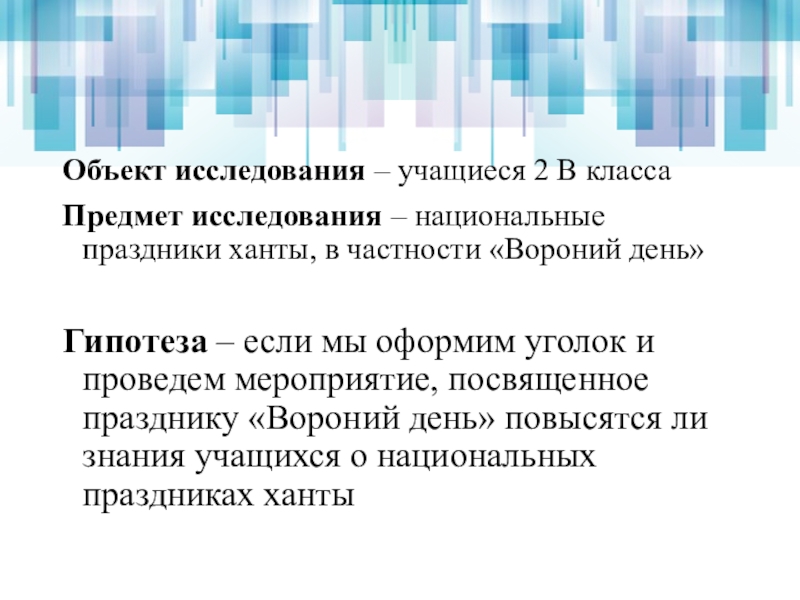Объект исследования – учащиеся 2 В классаПредмет исследования – национальные праздники ханты, в частности «Вороний день»Гипотеза –