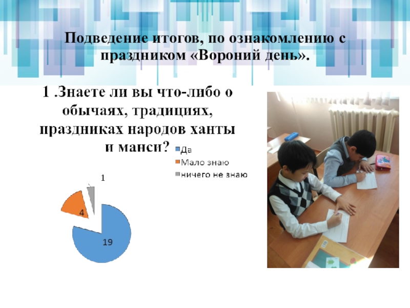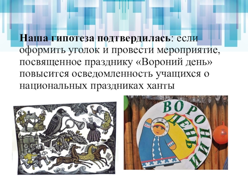 Гипотеза – если мы оформим уголок и проведем мероприятие, посвященное празднику «Вороний день» повысятся ли знания учащихся о национальных праздниках ханты