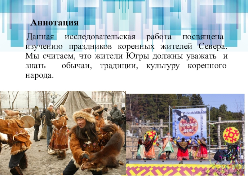Аннотация Данная исследовательская работа посвящена изучению праздников коренных жителей Севера. Мы считаем, что