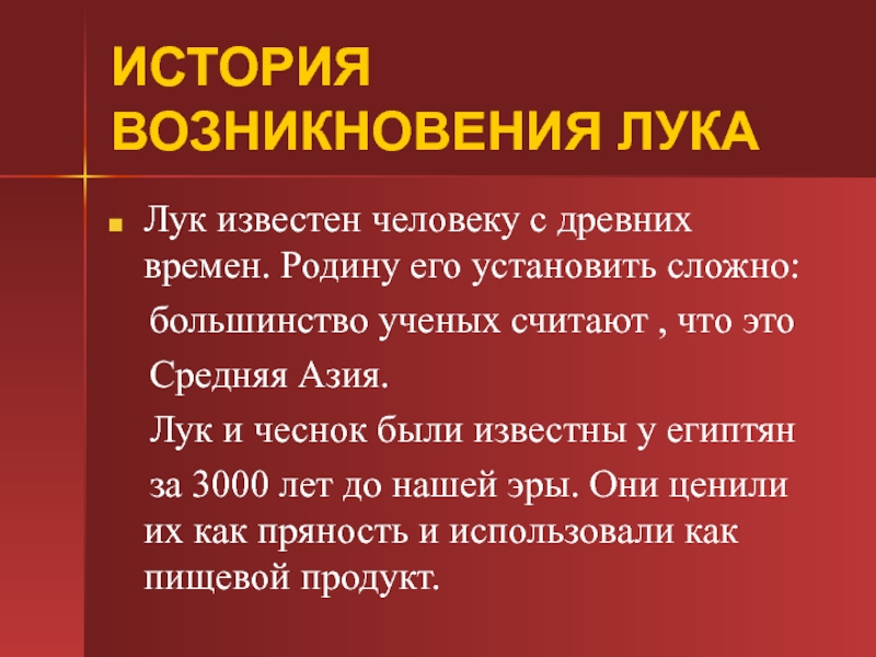 Слайд 11ИСТОРИЯ ВОЗНИКНОВЕНИЯ ЛУКА