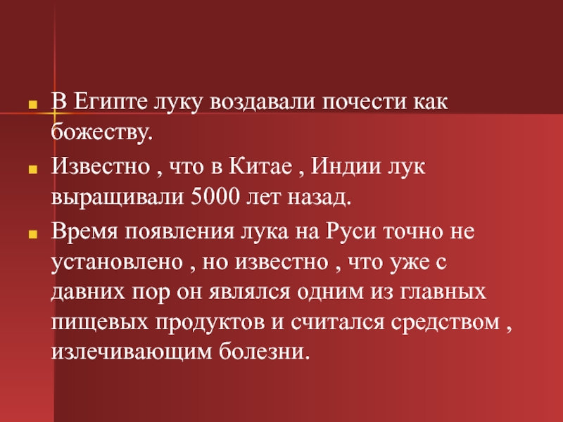 Время появления лука на Руси точно не установлено , но известно , что уже с давних пор он являлся одним из главных пищевых продуктов и считался средством , излечивающим болезни.