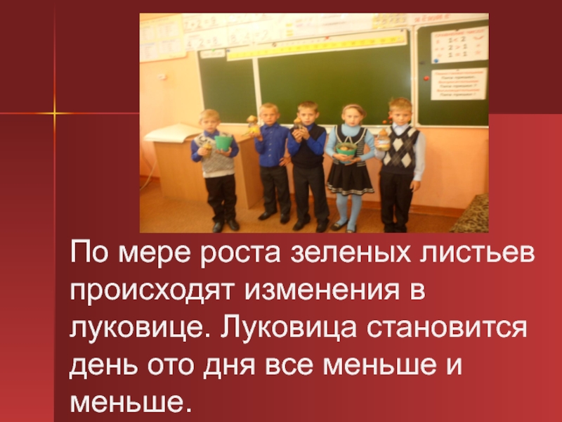 Слайд 17По мере роста зеленых листьев происходят изменения в луковице. Луковица становится