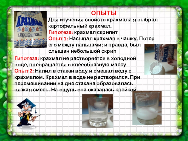 Гипотеза: крахмал не растворяется в холодной воде, превращается в клееобразную массу