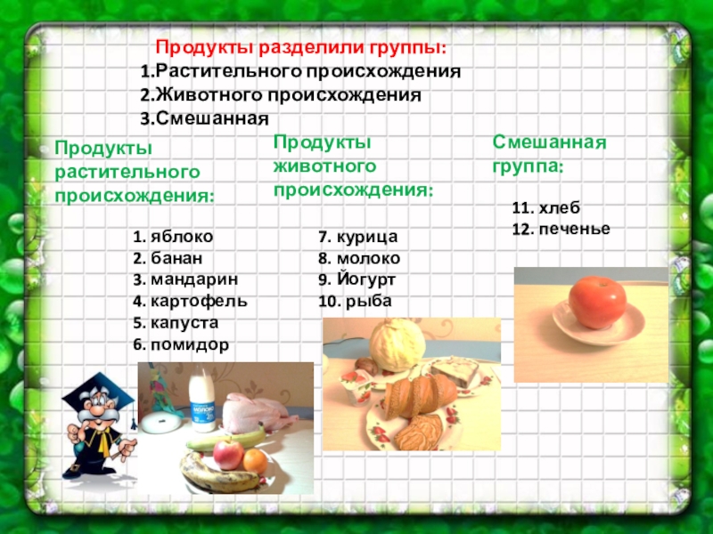 Капуста, помидор и выпечка были выбраны дополнительно из опроса, они набрали равные голоса с фруктами и йогуртом