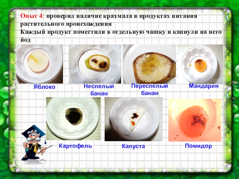 Из опыта видно картофель содержит много крахмала. Рыба и мясо и остальные продукты крахмал не содержат.