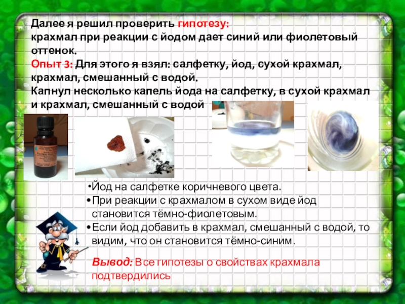 Вывод: Все гипотезы о свойствах крахмала подтвердились