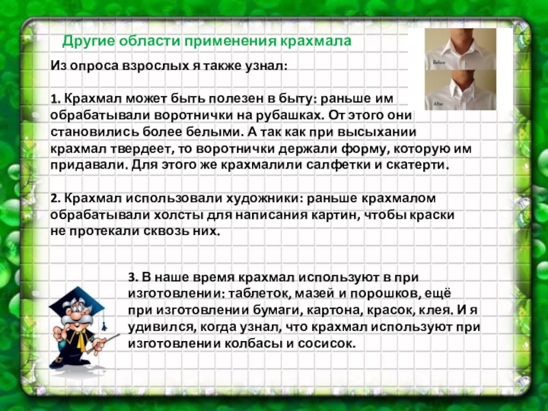 при изготовлении бумаги, картона, красок, клея. И я удивился, когда узнал, что крахмал используют при изготовлении колбасы и сосисок.