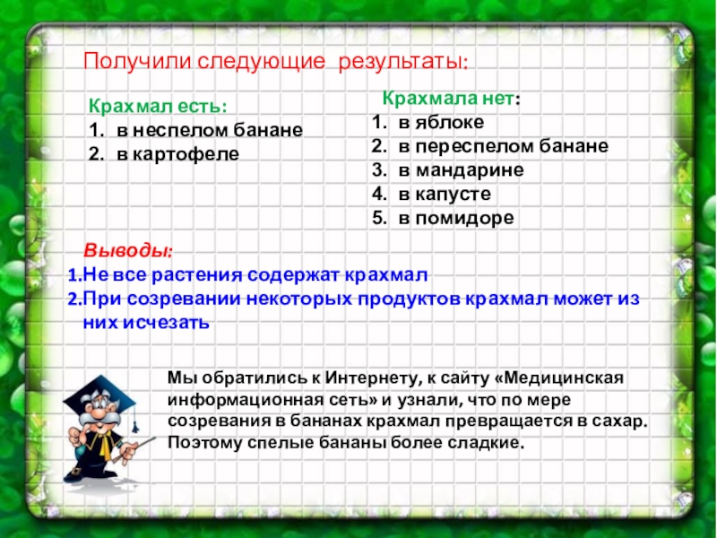 Мы обратились к Интернету, к сайту «Медицинская информационная сеть» и узнали, что по мере созревания в бананах крахмал превращается в сахар. Поэтому спелые бананы более сладкие.