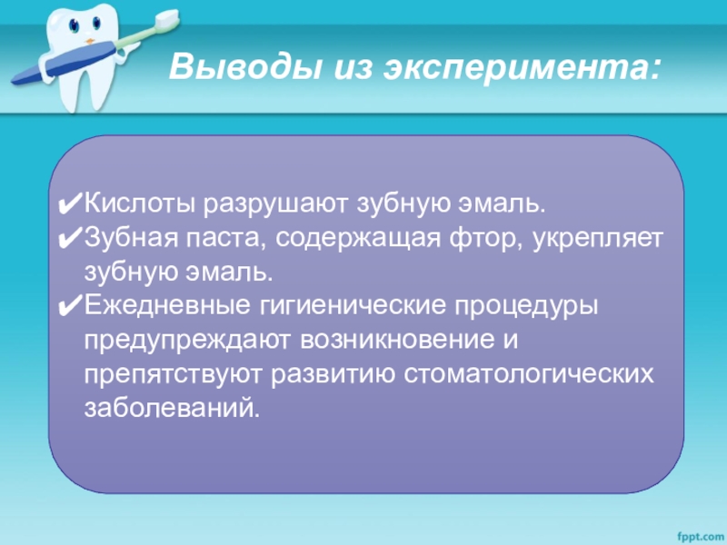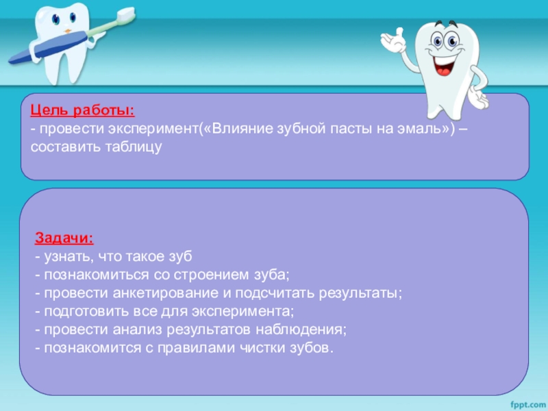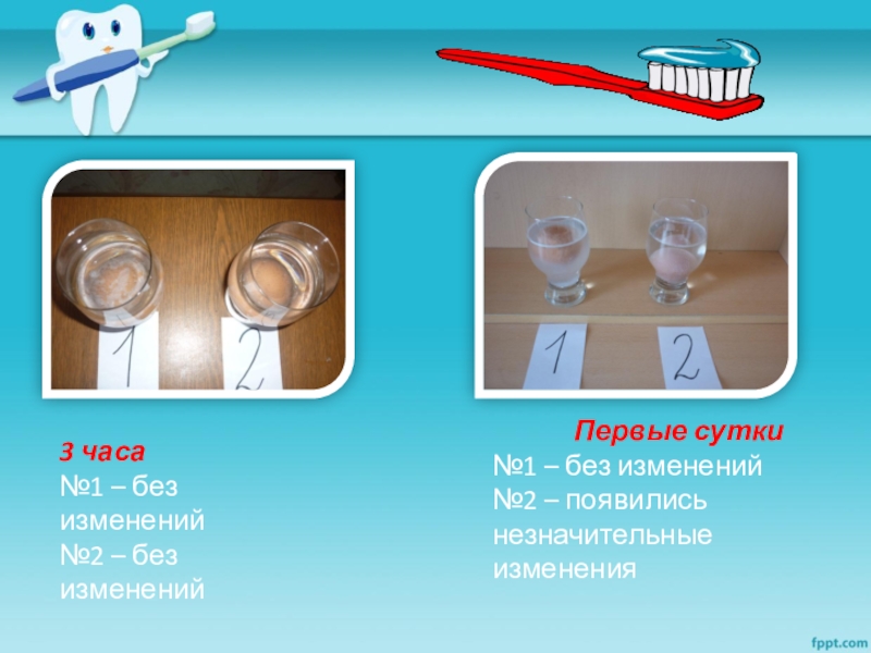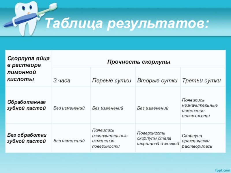 - провести эксперимент(«Влияние зубной пасты на эмаль») – составить таблицу
