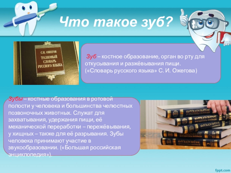 Зубы – костные образования в ротовой полости у человека и большинства челюстных позвоночных животных. Служат для захватывания, удержания пищи, её механической переработки – пережёвывания, у хищных – также для её разрывания. Зубы человека принимают участие в звукообразовании. («Большая российская энциклопедия»).