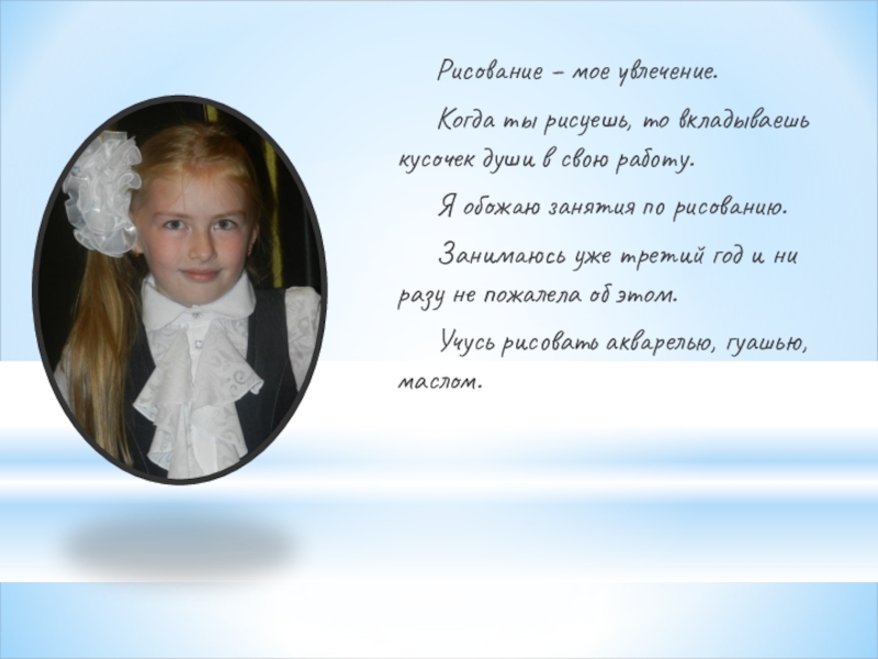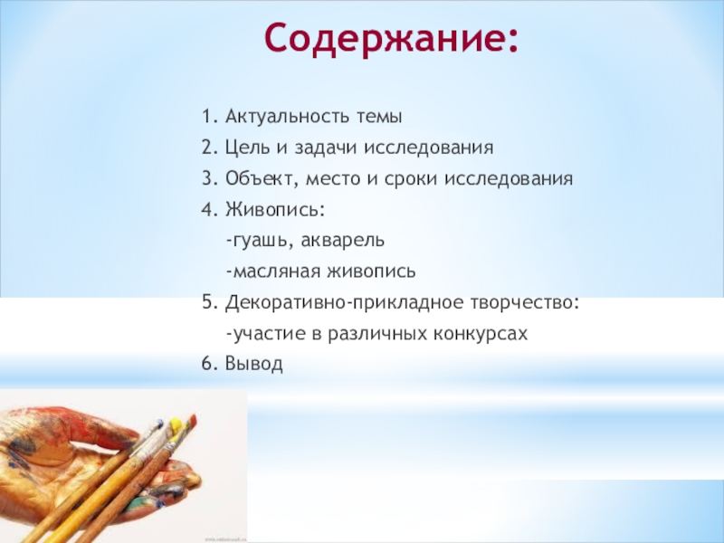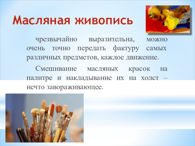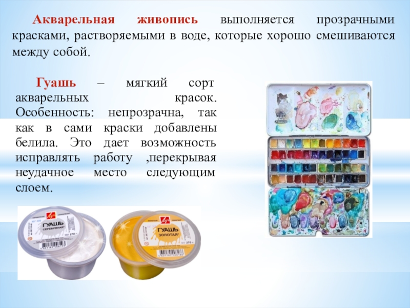 Гуашь – мягкий сорт акварельных красок. Особенность: непрозрачна, так как в сами краски добавлены белила. Это дает возможность исправлять работу ,перекрывая неудачное место следующим слоем.