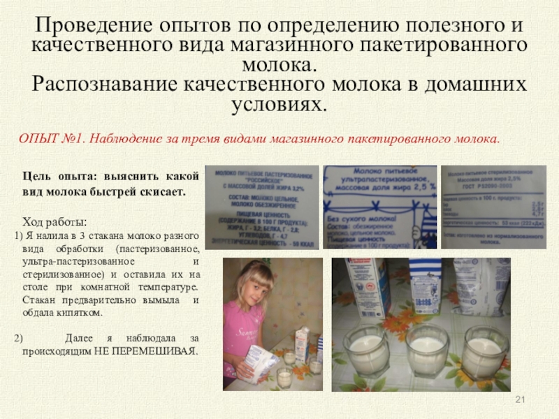 Проведение опытов по определению полезного и качественного вида магазинного пакетированного молока. Распознавание качественного молока в домашних условиях.