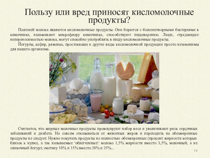 Слайд 14Пользу или вред приносят кисломолочные продукты?