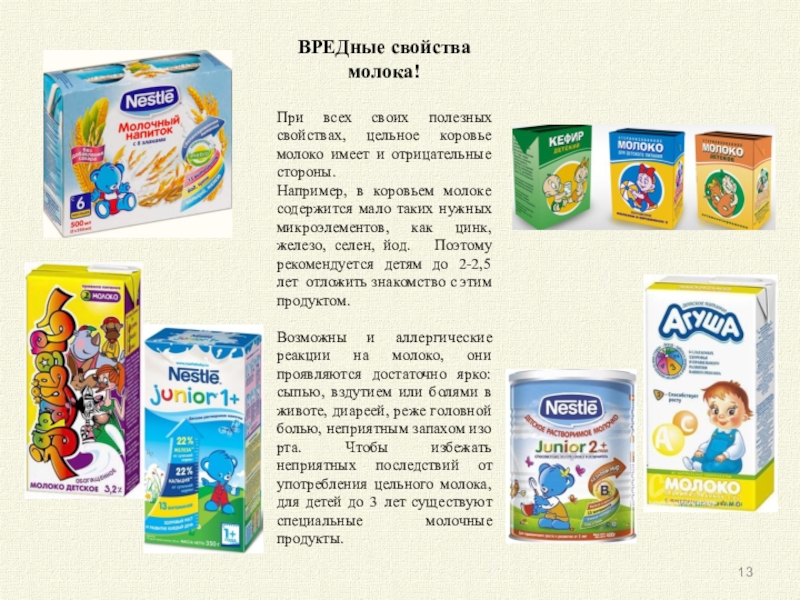 Например, в коровьем молоке содержится мало таких нужных микроэлементов, как цинк, железо, селен, йод. Поэтому рекомендуется детям до 2-2,5 лет отложить знакомство с этим продуктом.