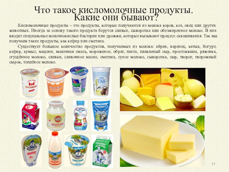 которые получаются из молока коров, коз, овец или других животных. Иногда за основу такого продукта берутся сливки, сыворотка или обезжиренное молоко. В них вводят специальные молочнокислые бактерии или дрожжи, которые вызывают процесс сквашивания. Так мы получаем такие продукты, как кефир или сметана.