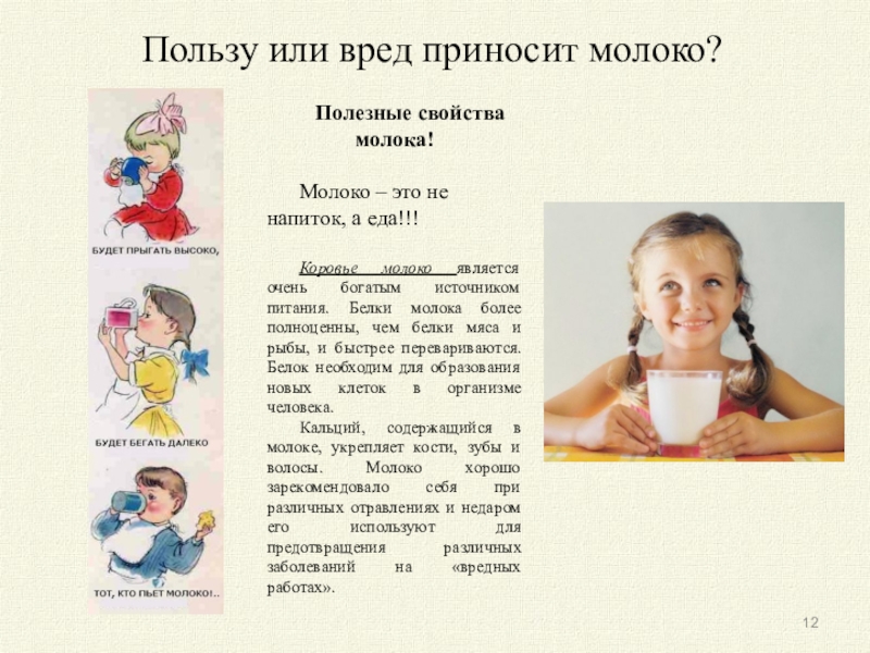 Кальций, содержащийся в молоке, укрепляет кости, зубы и волосы. Молоко хорошо зарекомендовало себя при различных отравлениях и недаром его используют для предотвращения различных заболеваний на «вредных работах».
