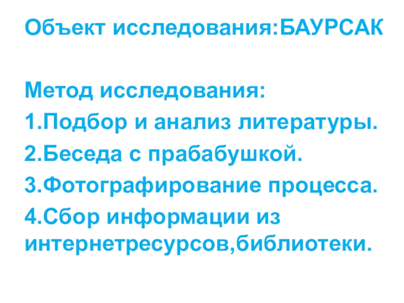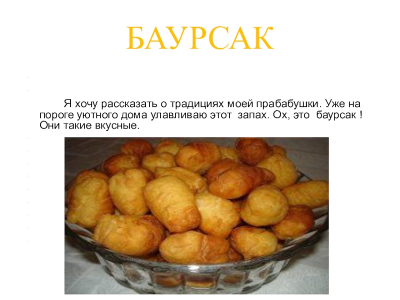 Слайд 5Изучить вопрос о том,с каких пор готовят вкуснейшее лакомство моего народа-БАУРСАК,почему