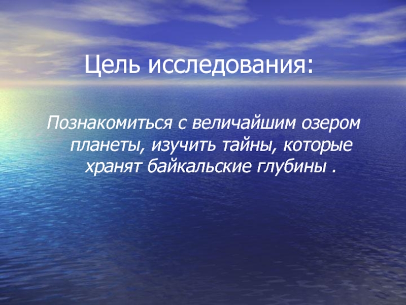 Цель исследования:Познакомиться с величайшим озером планеты, изучить тайны, которые хранят байкальские глубины .