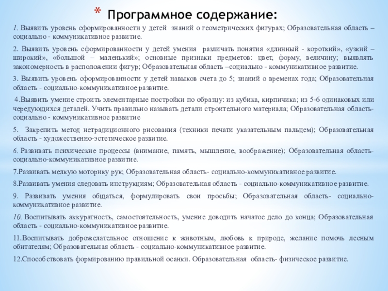 Программное содержание:1. Выявить уровень сформированности у детей знаний о геометрических фигурах; Образовательная область –социально - коммуникативное развитие.2. Выявить уровень сформированности у детей умения различать понятия «длинный - короткий», «узкий – широкий», «большой – маленький»; основные признаки предметов: