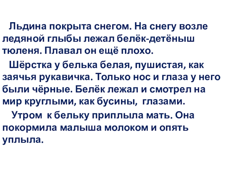 Льдина покрыта снегом. На снегу возле ледяной глыбы лежал белёк-детёныш тюленя. Плавал он ещё плохо. Шёрстка у белька белая, пушистая, как заячья рукавичка. Только нос и глаза у него были чёрные. Белёк лежал