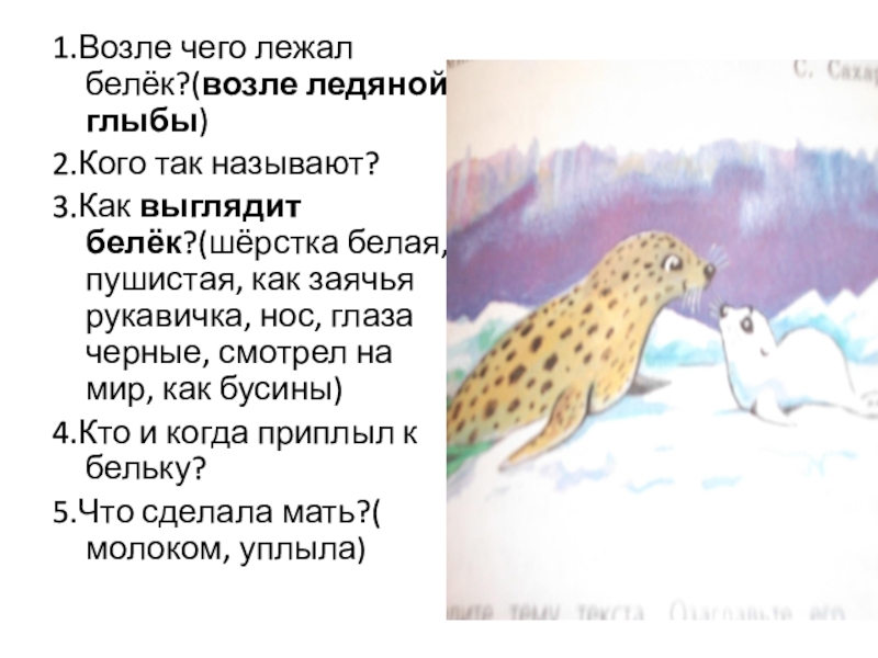 1.Возле чего лежал белёк?(возле ледяной глыбы)2.Кого так называют?3.Как выглядит белёк?(шёрстка белая, пушистая, как заячья рукавичка, нос, глаза