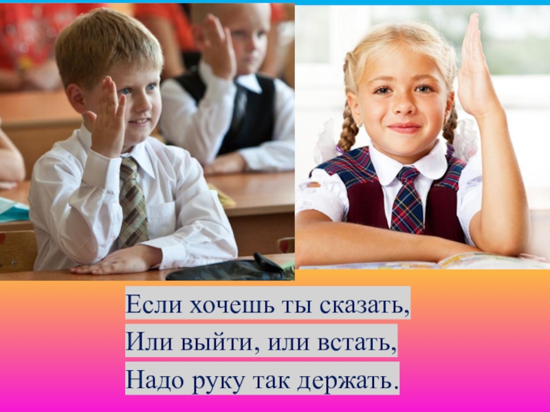 Если хочешь ты сказать,Или выйти, или встать,Надо руку так держать.