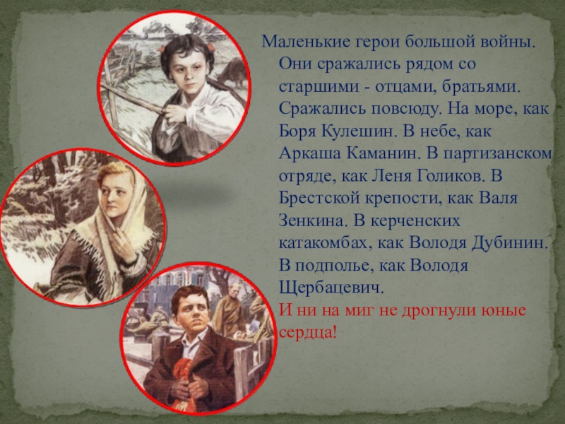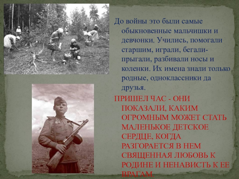 ПРИШЕЛ ЧАС - ОНИ ПОКАЗАЛИ, КАКИМ ОГРОМНЫМ МОЖЕТ СТАТЬ МАЛЕНЬКОЕ ДЕТСКОЕ СЕРДЦЕ, КОГДА РАЗГОРАЕТСЯ В НЕМ СВЯЩЕННАЯ ЛЮБОВЬ К РОДИНЕ И НЕНАВИСТЬ К ЕЕ ВРАГАМ.