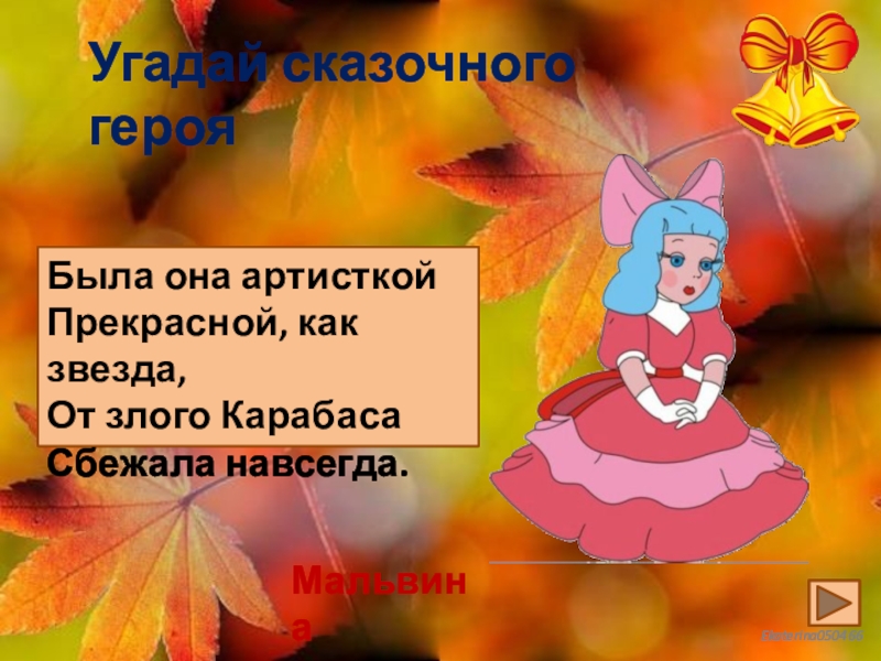 Угадай сказочного герояБыла она артисткойПрекрасной, как звезда,От злого КарабасаСбежала навсегда.Мальвина