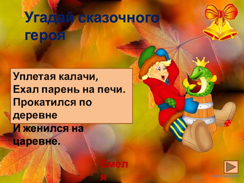 Угадай сказочного герояУплетая калачи,Ехал парень на печи.Прокатился по деревнеИ женился на царевне.Емеля