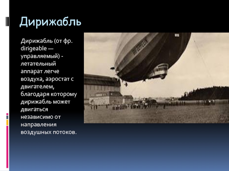 ДирижабльДирижабль (от фр. dirigeable — управляемый) - летательный аппарат легче воздуха, аэростат с двигателем, благодаря которому дирижабль
