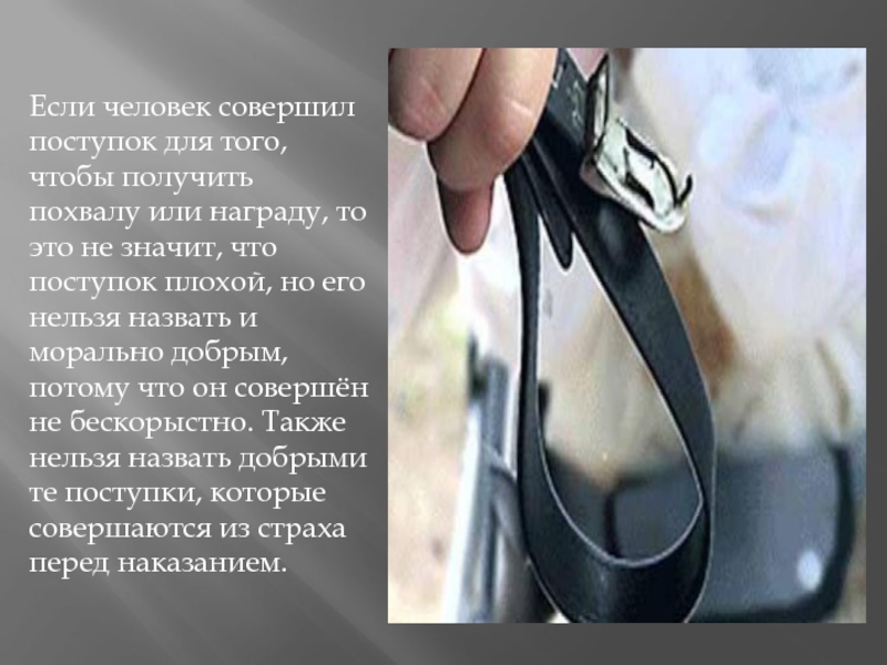 получить похвалу или награду, то это не значит, что поступок плохой, но его нельзя назвать и морально добрым, потому что он совершён не бескорыстно. Также нельзя назвать добрыми те поступки, которые совершаются из страха перед наказанием.