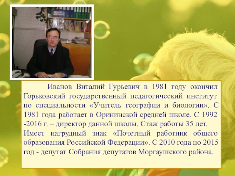 Вязов Иван Димитиревич родился 1 октября 1922 года в д.Адабай Ориниской сельской администрации – учитель, народный академик.