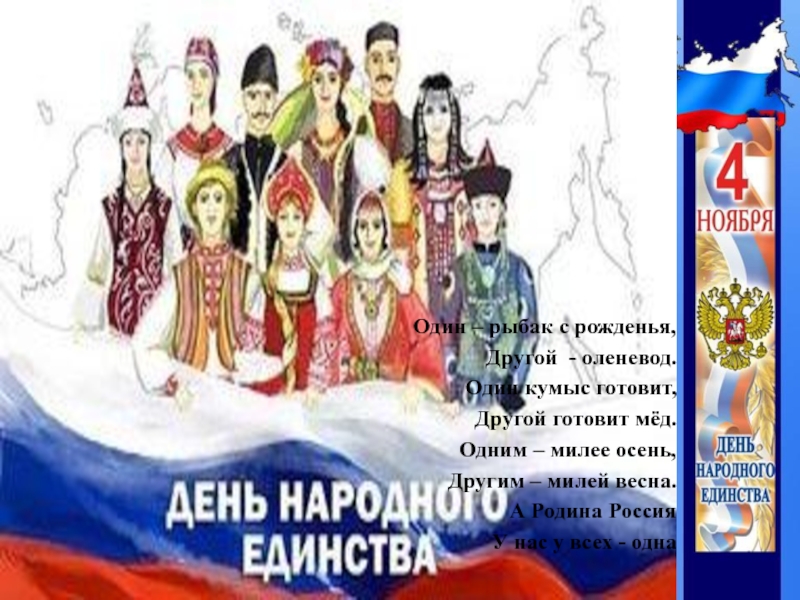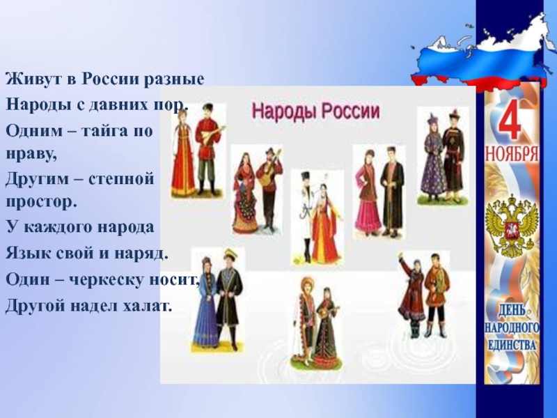 Живут в России разныеНароды с давних пор.Одним – тайга по нраву,Другим – степной простор.У каждого народаЯзык свой