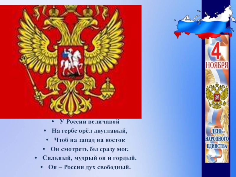 У России величавойНа гербе орёл двуглавый,Чтоб на запад на востокОн смотреть бы сразу мог.Сильный, мудрый он и
