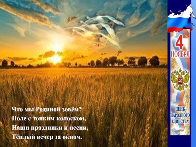 Что мы Родиной зовём?Поле с тонким колоском,Наши праздники и песни,Тёплый вечер за окном.